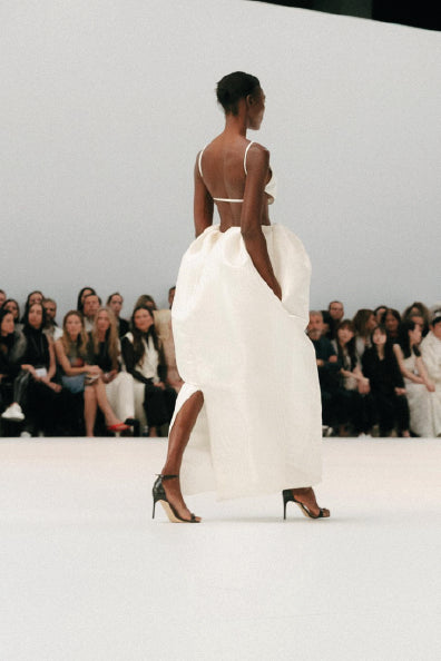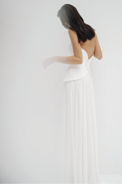 Confeccionado en organza de seda. Largo al suelo. Silueta de gabardina clásica.